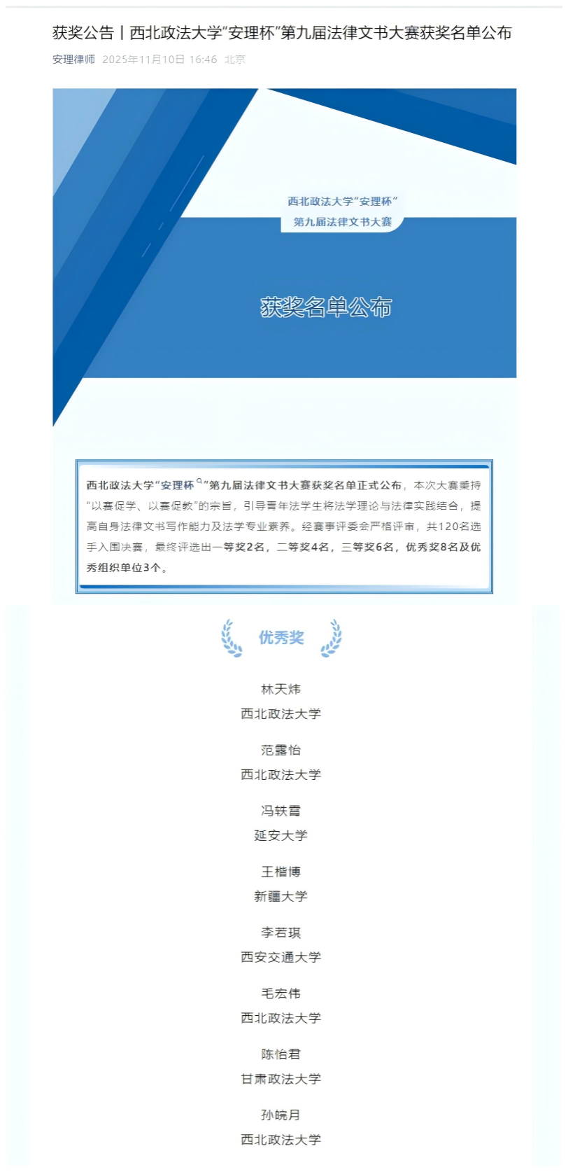 近日,由西北政法大学与安理律师事务所西安办公室联合主办的第九届 “安理杯”法律文书大赛圆满落幕,经赛事评委会严格评审,决赛评选出一等奖2名,二等奖8名,三等奖6名,优秀奖8名。政管学院2025级法律(非法学)专业研究生冯轶霄在指导教师宋晓芳副教授指导下,凭借扎实的法律理论功底、严谨的逻辑思维能力和充分的赛前准备,从120名进入决赛的参赛选手中脱颖而出,荣获大赛优秀奖。